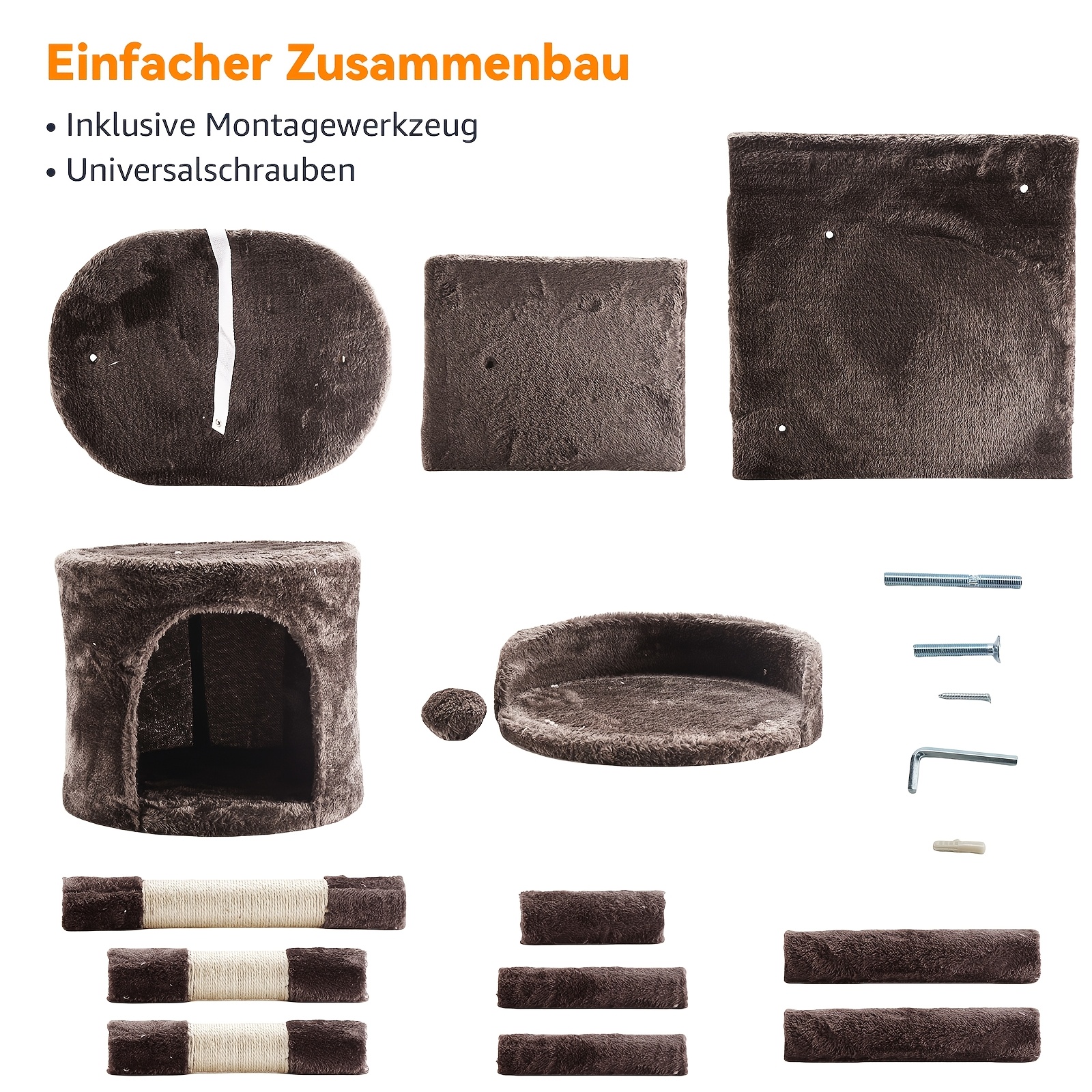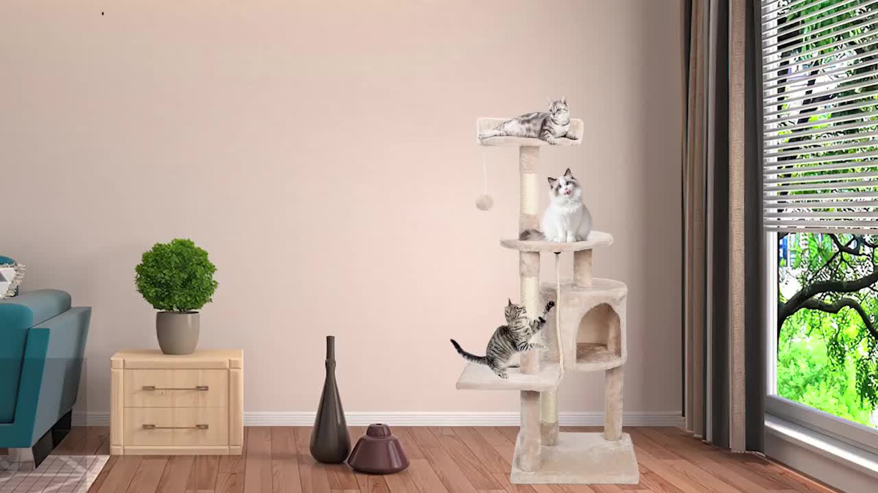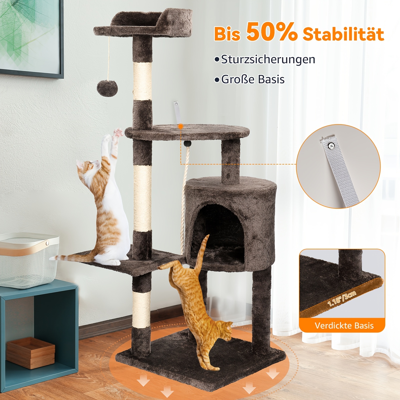 Descriere: Casa confortabilă pentru pisici îți invită pisica să se relaxeze și să se ascundă. O de pluș oferă distracția necesară, iar o de joc de pluș este suspendată sub platforma superioară. Există trei platforme pe care pisicile pot alege să sară sau să se odihnească. Un stâlp de zgâriat din sisal rezistent și o frânghie suplimentară de sisal oferă îngrijirea labelor și ține pisicile departe de mobilă