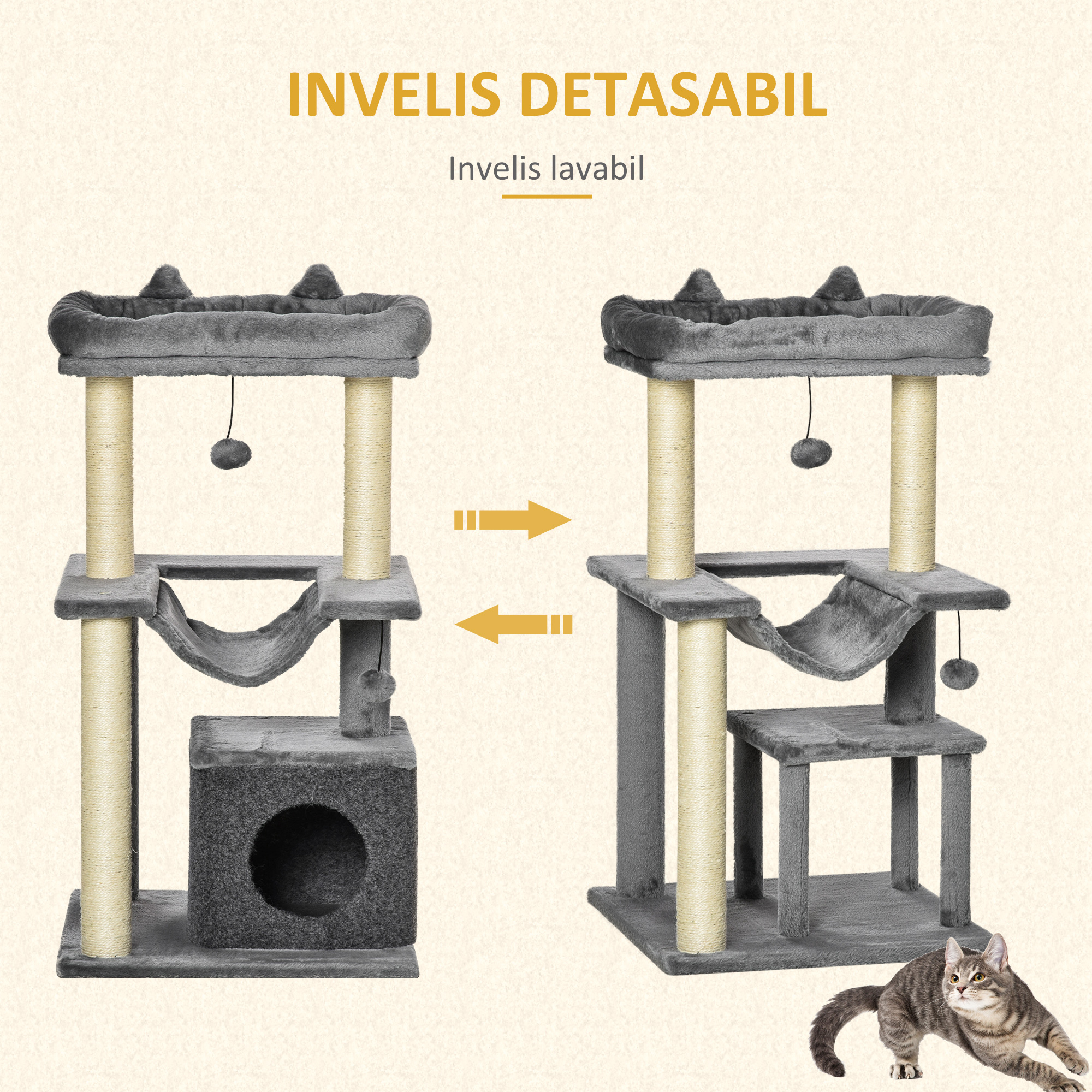 Daca aveti acasa o pisica atunci cu siguranta doriti sa ii creati un spatiu special unde sa se joace sau sa se odihneasca. PawHut centru activitati pentru pisici, 48x48x100 cm, gri este produsul de care aveti nevoie. Are mai multe nivele prevazute cu stalpi pentru zgariere, casuta cu usa detasabila, hamac, pat si minge. Stalpii sunt captusiti cu franghie de sisal, perfect pentru ca pisicile sa isi ascuta unghiile. Astfel ca mobila sau canapeaua din casa vor fi in siguranta. Captuseala de plus este ideala pentru ca pisicile sa se simta cat mai confortabil atunci cand se odihnesc sau cand se joaca. Casuta de asemenea este spatiul special pentru dormit, are husa detasabila si lavabila. PawHut centru activitati pentru pisici, 48x48x100 cm, gri este fabricat din PAL solid, arborele are structura solida si stabila. Potrivit pentru pisici de pana la 4,5 kg. Este necesara asamblarea. Caracteristici